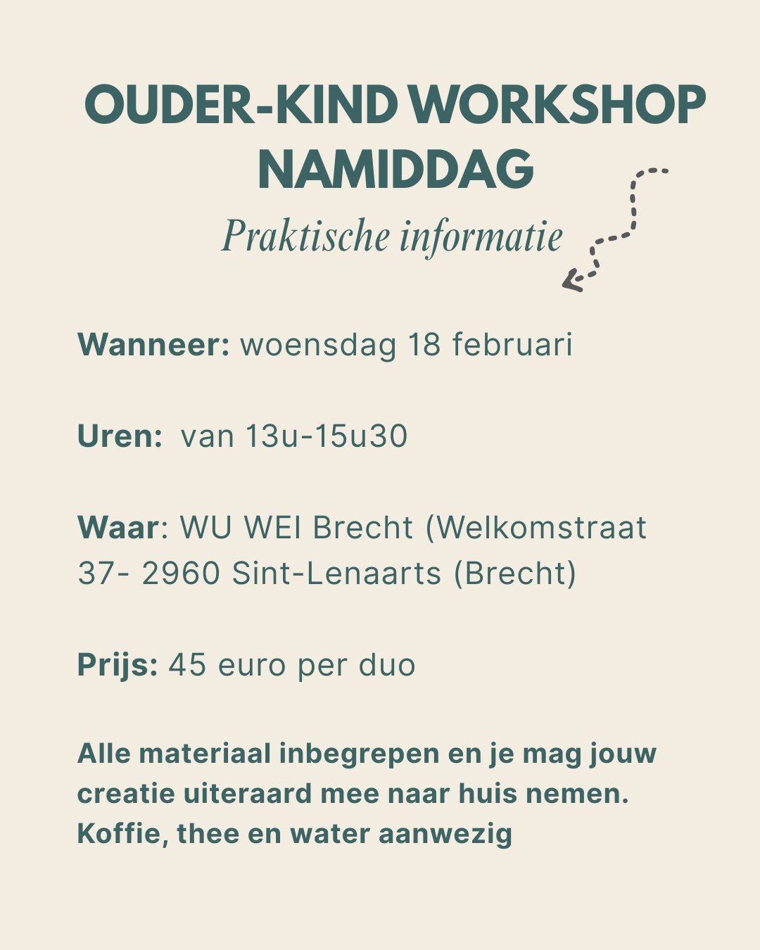 Alle materiaal zijn in de prijs inbegrepen en je mag jouw creatie uiteraard mee naar huis nemen. Koffie, thee en water zijn ook aanwezig.